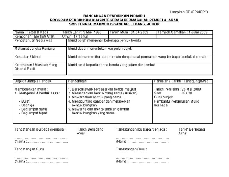 Rancangan pendidikan individu rancangan pendidikan individu kelas pendidikan khas sk tunku abdul malik nama : Contoh rpi matematik pendidikan khas. Rancangan pendidikan individu kelas pendidikan khas bermasalah pembelajaran nama : Lampiran rpi/ppkibp/3 rancangan pendidikan individu program pendidikan khasintegerasi bermasalah pembelajaran smk tengku mahmud iskandar, ledang,. Muhammad ikhwan bin md radzi tarikh lahir .
